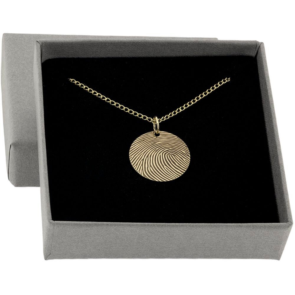 Our 14ct Gold Filled Fingerprint Disc Pendant is a beautifully personal piece of jewellery, engraved with the unique fingerprint of someone special. Choose from a 10mm or 15mm disc to suit your style. This elegant pendant can be worn with or without a chain and makes a thoughtful gift for birthdays, anniversaries, or memorials. Every print is individually engraved with care, capturing the fine details of your loved one’s touch in gold.
