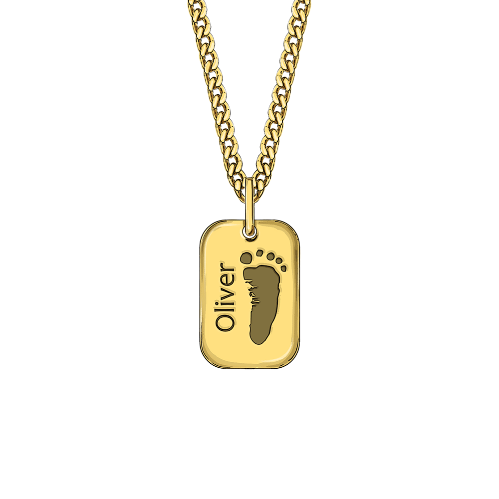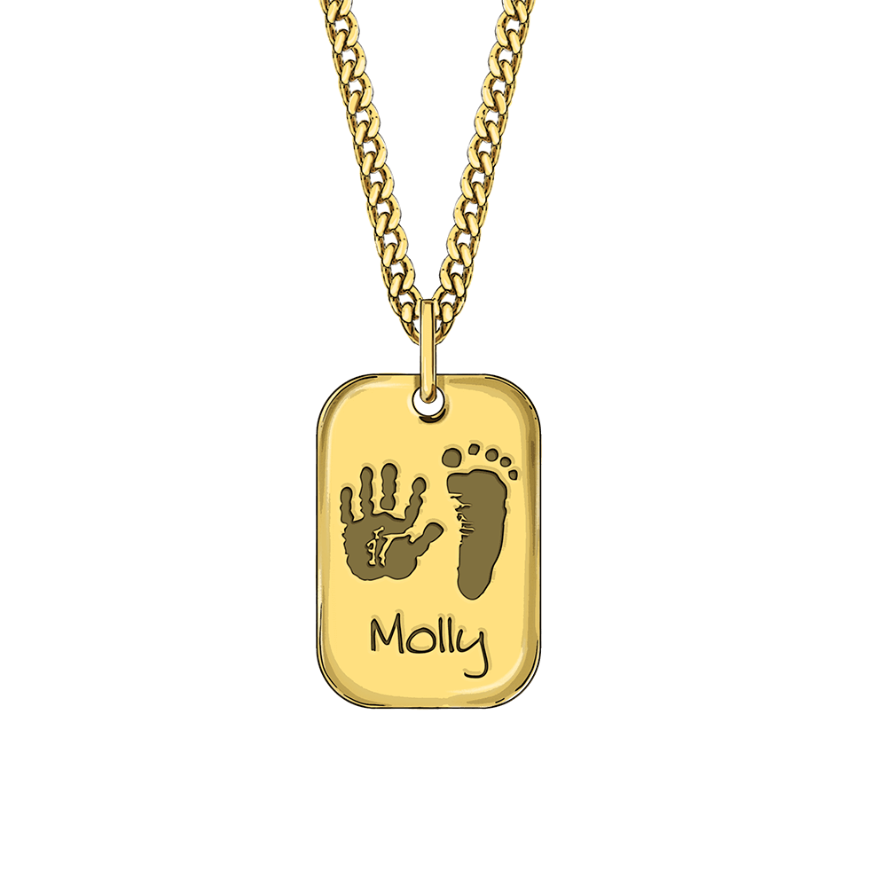 A beautiful upgrade to our sterling silver range, this gold tag pendant is available in 2 sizes. Capture your loved ones hand and/or footprint in an engraved 9ct Gold tag shaped pendant for a truly personal gift to be treasured a lifetime. More than one child? no problem, just add multiple pendants to the chain in the options.