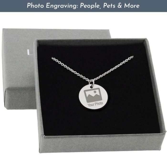 Transform your cherished moments into timeless treasures with our custom photo engraving service on this beautiful sterling silver disc pendant in a rage of different sizes. Whether it’s a beloved pet, a baby’s tiny handprint, a couple’s portrait, or a special family photo, we engrave your memories with stunning clarity and craftsmanship.