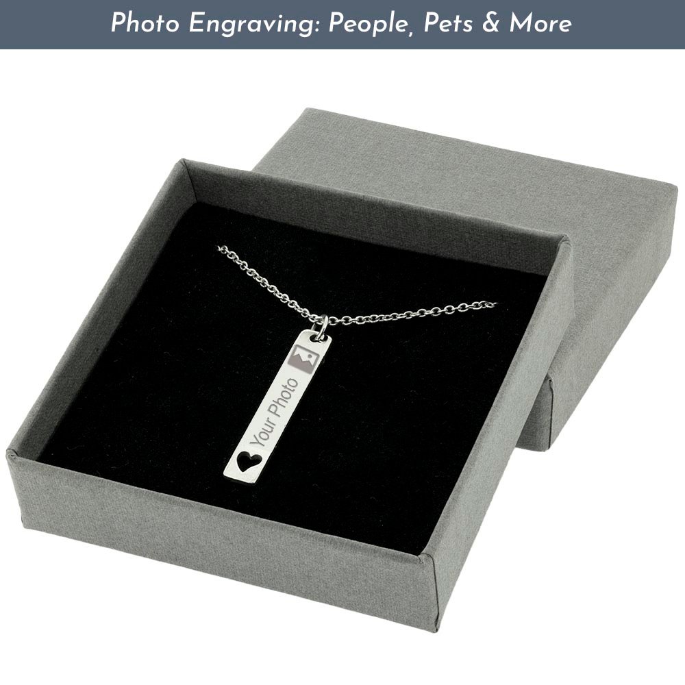 Transform your cherished moments into timeless treasures with our custom photo engraving service on this beautiful sterling silver rectangular pendant with optional heart cut out. Whether it’s a beloved pet, a baby’s tiny handprint, a couple’s portrait, or a special family photo, we engrave your memories with stunning clarity and craftsmanship.