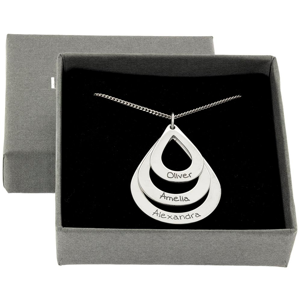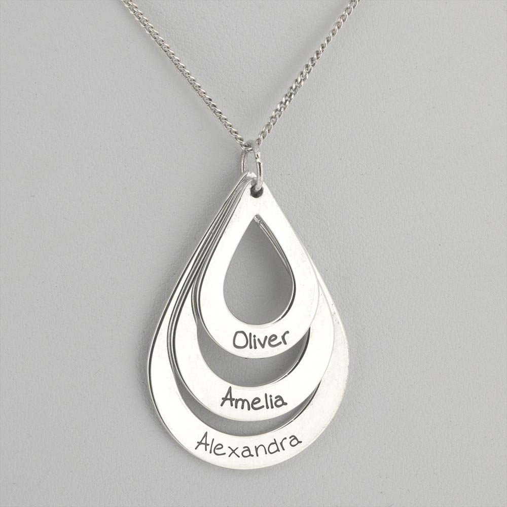 Open teardrop necklaces provide a beautiful way to share the love of your children. Choose the number of silver open teardrop pendants, engrave the names of your loved ones and add a chain of your choice.