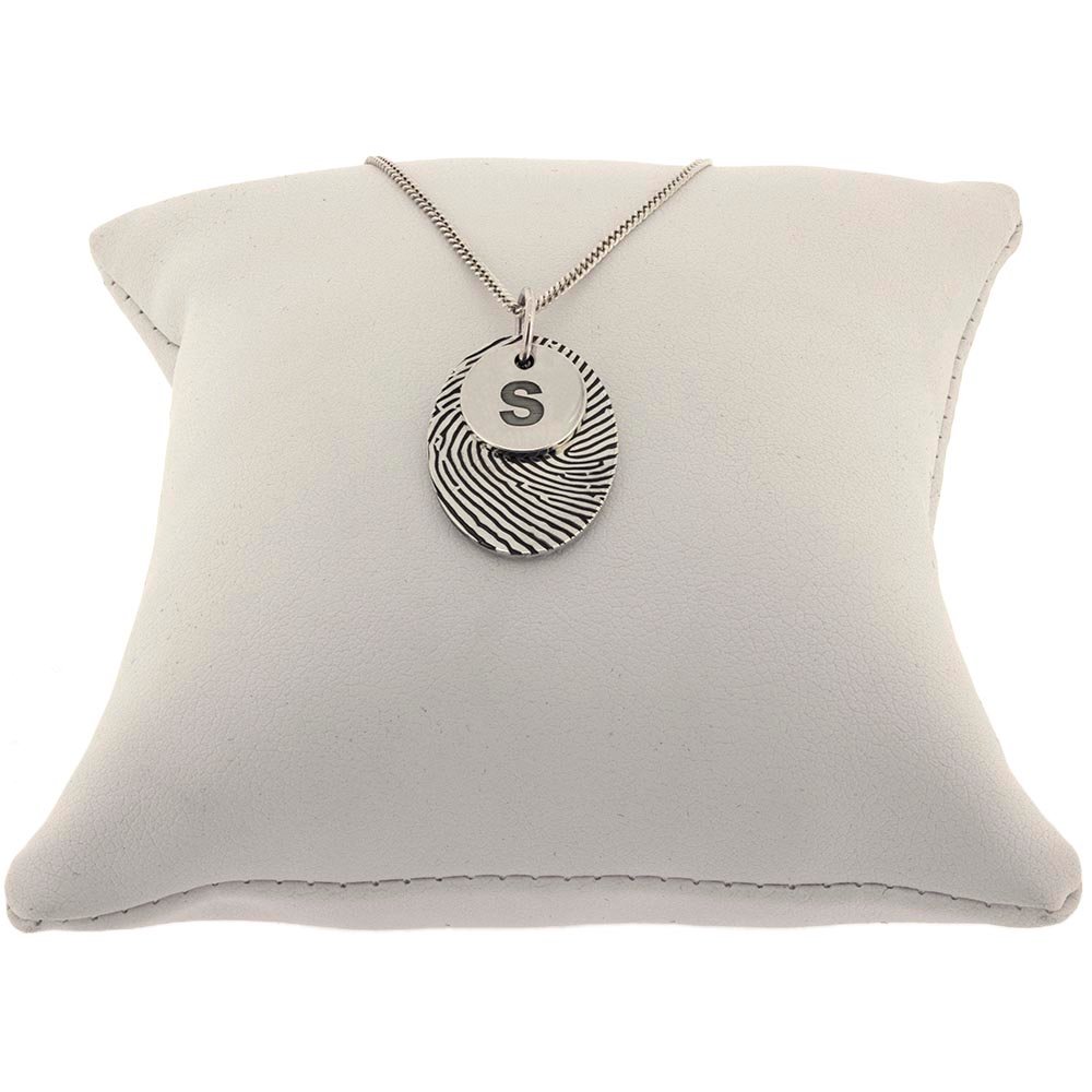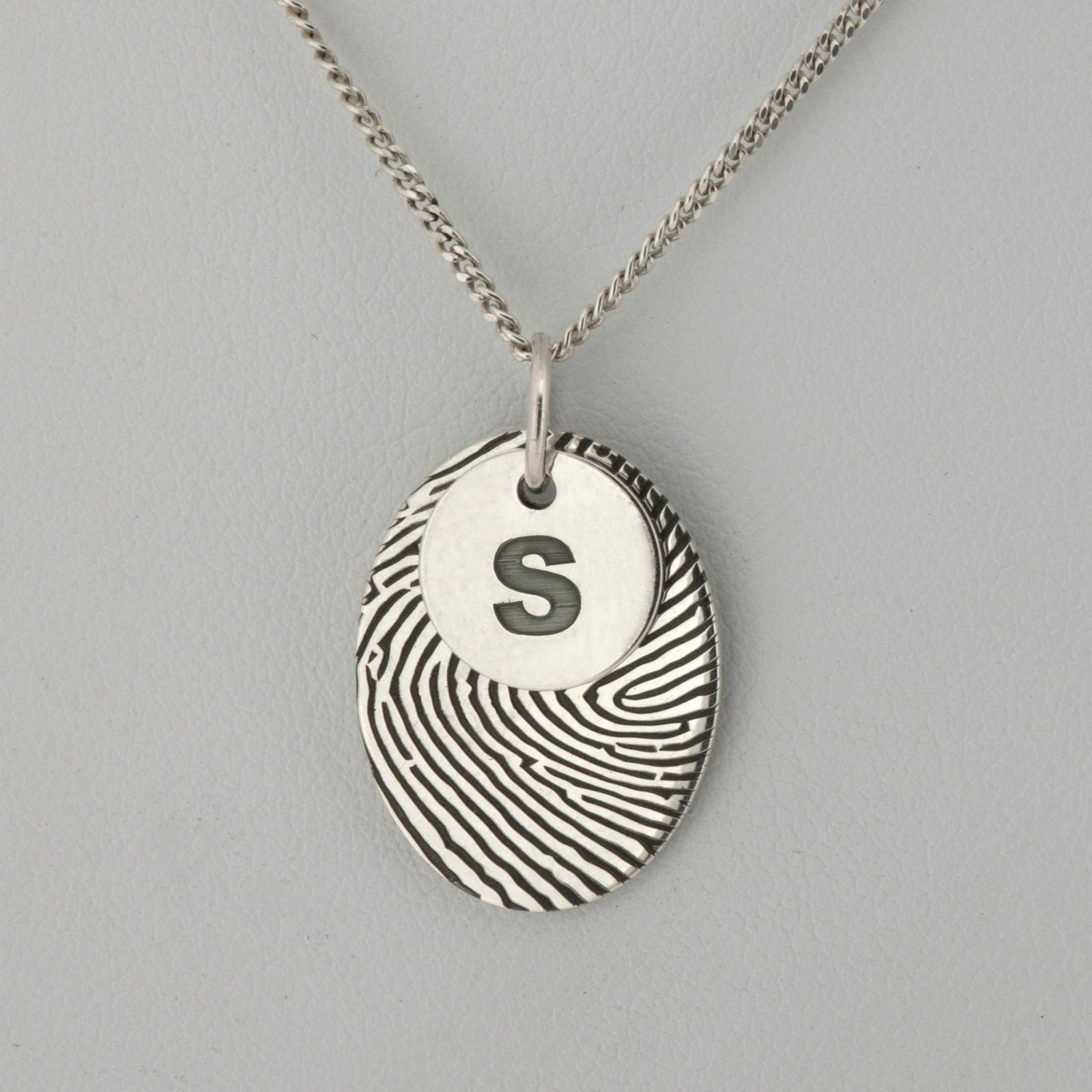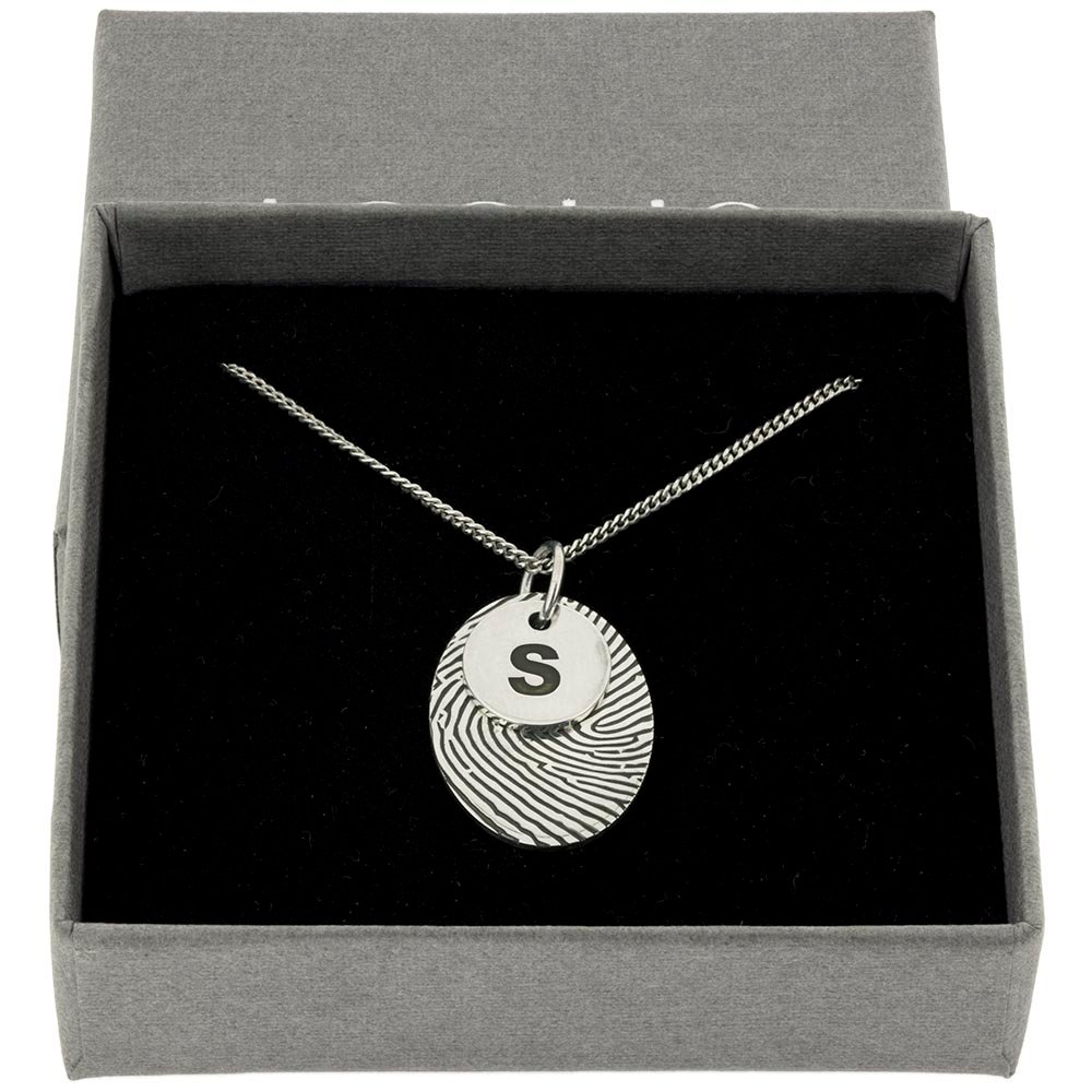 A twist on our simple oval pendants. Capture your loved ones finger print in an engraved sterling silver oval pendant and choose a name or letter of your choice to add to a smaller silver disc to make a truly personal gift to be treasured a lifetime.