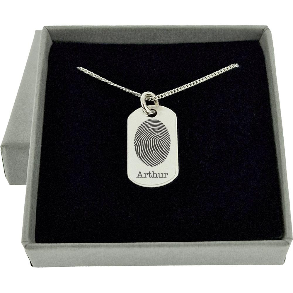 This silver fingerprint dog tag pendant combines classic style with personal meaning. Made from sterling silver and sized at 23x13mm, it’s engraved with a loved one’s fingerprint in crisp detail. You can add a name, date, or short message on the back, and choose from a curb or trace chain in your preferred length. A timeless keepsake often chosen for men, but perfect for anyone wanting a modern and meaningful design.
