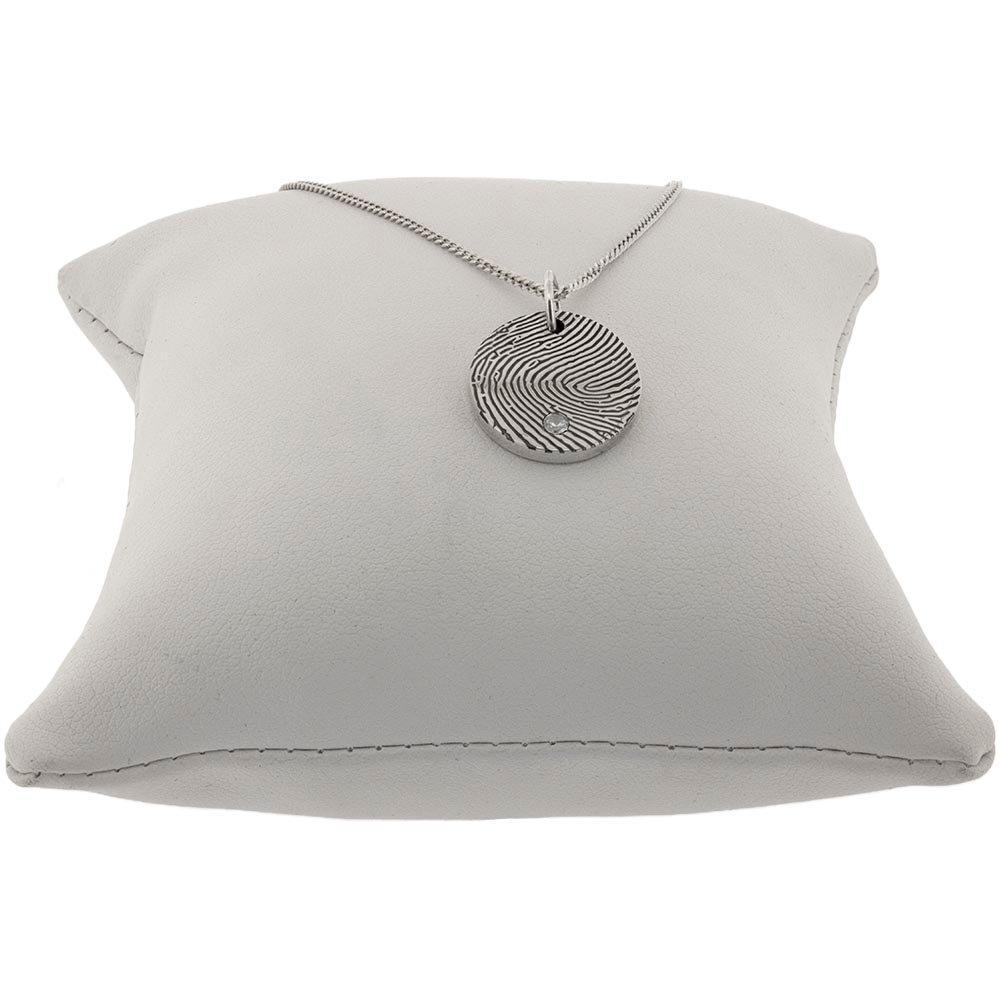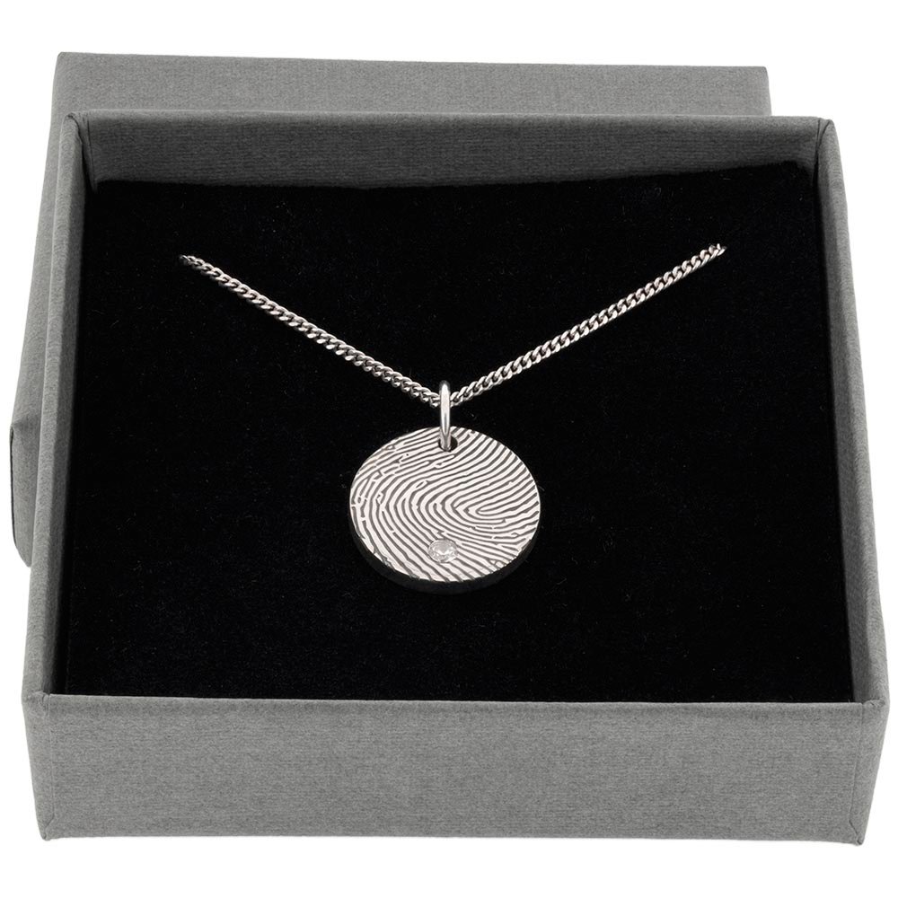 This silver fingerprint pendant with CZ stone adds a subtle sparkle to a deeply meaningful keepsake. Available in 10mm or 15mm sizes, the disc is twice as thick as our classic design, measuring 2mm for a premium feel. A clear cubic zirconia is set into the disc for an elegant finish. Each pendant is engraved with a loved one’s fingerprint, creating a beautiful piece for celebration, remembrance, or everyday wear.