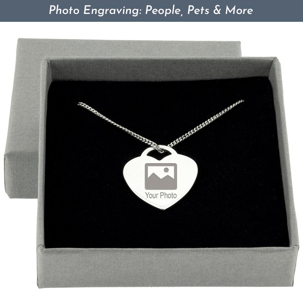 Transform your cherished moments into timeless treasures with our custom photo engraving service on this beautiful sterling silver heart shaped necklace. Whether it’s a beloved pet, a baby’s tiny handprint, a couple’s portrait, or a special family photo, we engrave your memories with stunning clarity and craftsmanship.